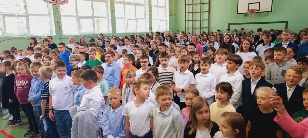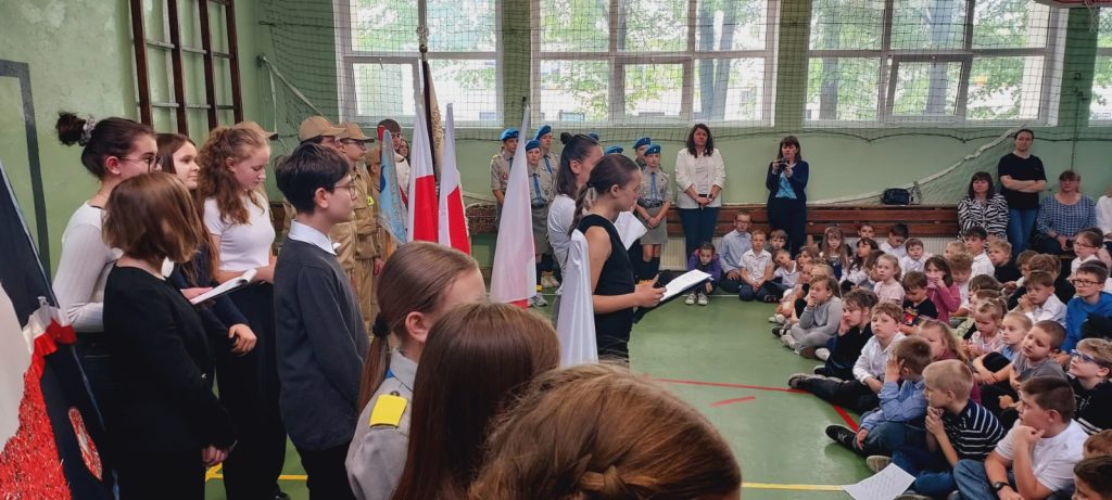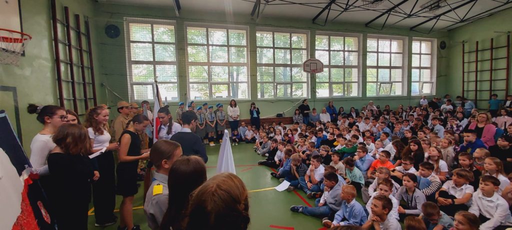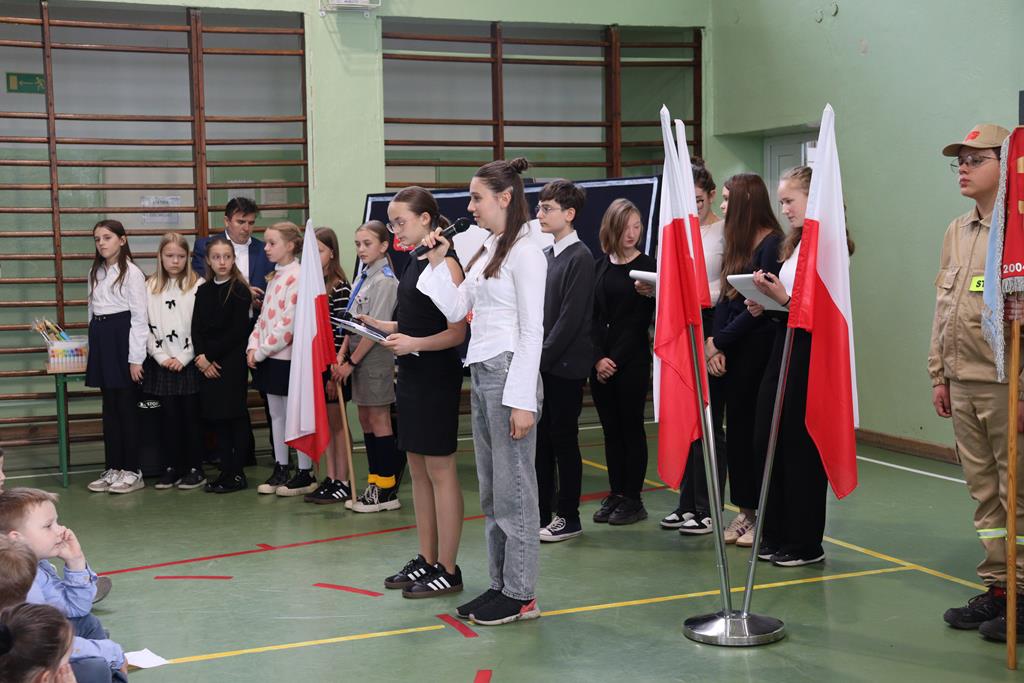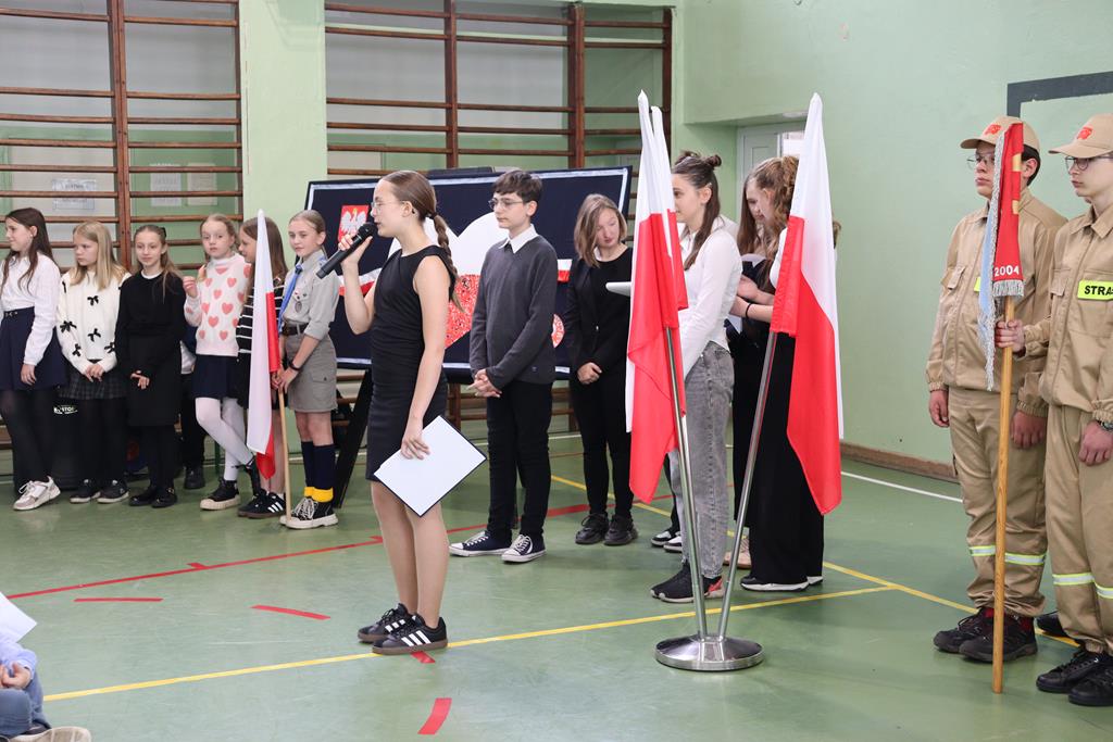 Mimo, że sala gimnastyczna była wypełniona po brzegi uczestnikami (znacznie ponad 400 osób), to jednak wszyscy zachowali się godnie, stosownie do tego wydarzenia. Imponujące wrażenie wywarł nasz wspólny śpiew hymnu (jak zawsze, całego). Lekcja patriotyzmu została przez wszystkich uczniów zaliczona na najwyższą ocenę.