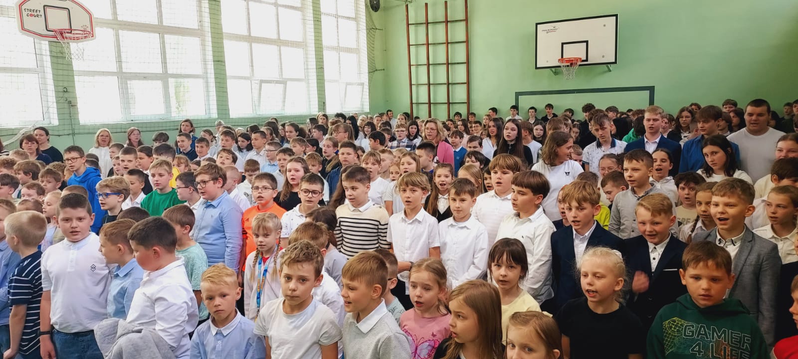 Mimo, że sala gimnastyczna była wypełniona po brzegi uczestnikami (znacznie ponad 400 osób), to jednak wszyscy zachowali się godnie, stosownie do tego wydarzenia. Imponujące wrażenie wywarł nasz wspólny śpiew hymnu (jak zawsze, całego). Lekcja patriotyzmu została przez wszystkich uczniów zaliczona na najwyższą ocenę.